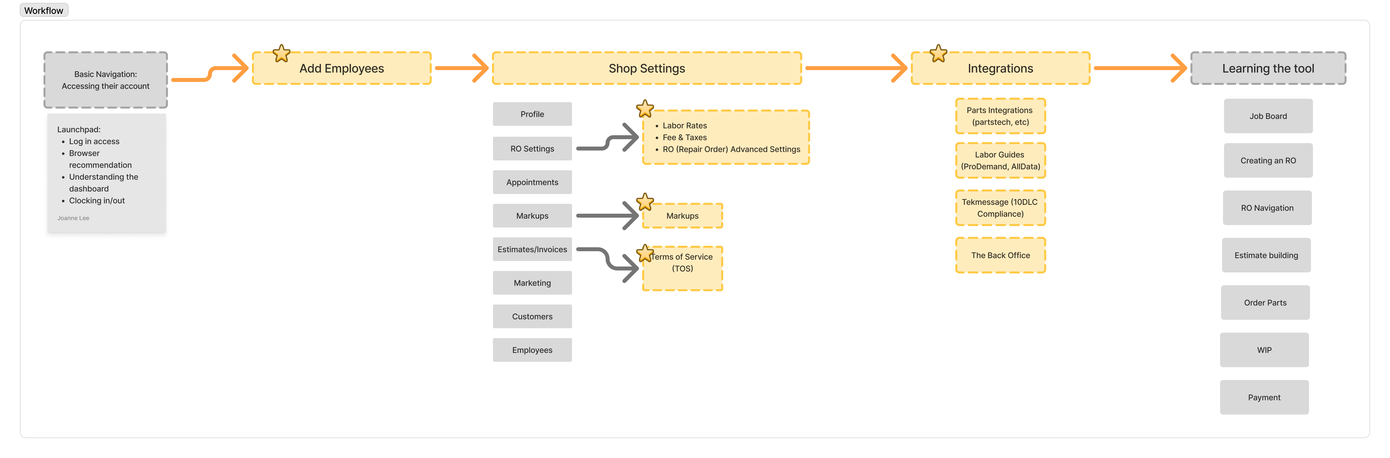 The onboarding team is so heavily involved because customers don’t know where to begin exploring the product when first starting. This is because there isn’t an in-app onboarding process empowering shops to learn on their own. I created a workflow of basic set up tasks that shops could do on their own.